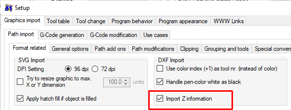注意:您的示例 testpanckake_dxf.txt 使用正 Z 值,这将接管 GCode。 |