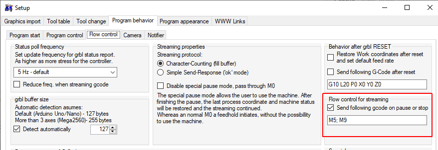 我担心它来自 GRBL 本身在触发 Door 输入时关闭配件……在这种情况下将很难解决。 我在“发送以下 gcode…”中只有 M5,没有 M9。所以我认为问题不在于此:/ 编辑:我会检查 GRBL 的 config.h 看看是否有一个选项。我希望渺茫,但我们永远不知道! |