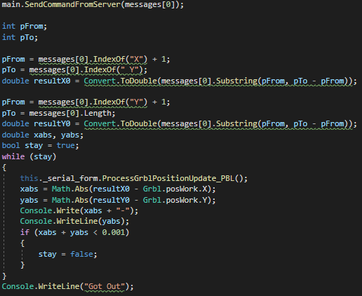 消息是一个坐标数组,如“X205 Y488”,当我启动此函数时,它会卡在 while 循环中,因为 X 和 Y 位置不会更新,但它仍会到达给定位置。我已经尝试制作并使用您的 ProcessGrblPositionUpdate 函数的公共版本,但它没有帮助。
