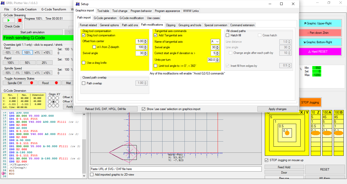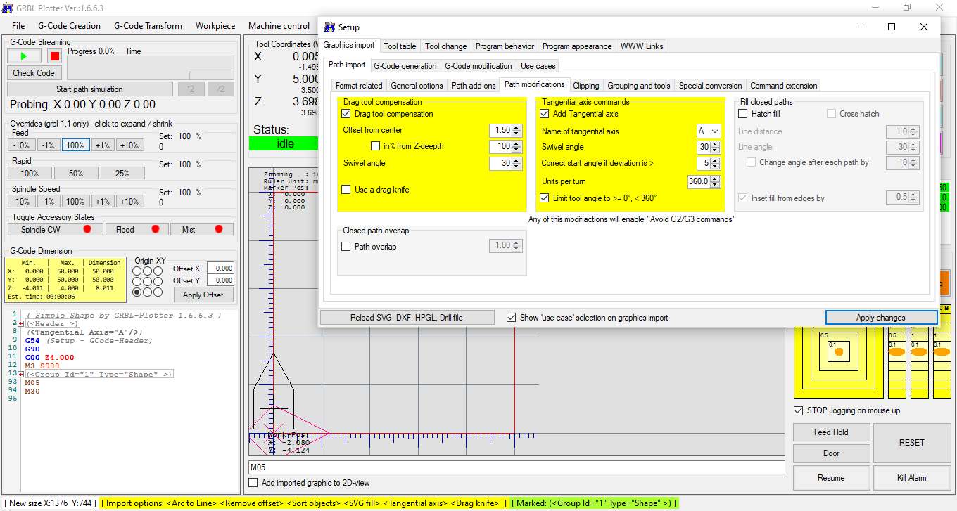 按照建议,我为切线刀操作启用了切线刀和拖刀选项。我从“创建简单形状”创建的 g 代码仍然没有考虑偏移量,并且我得到的 g 代码和图形是完整的因此每次刀被升高和降低时,由于偏移量会出现间隙